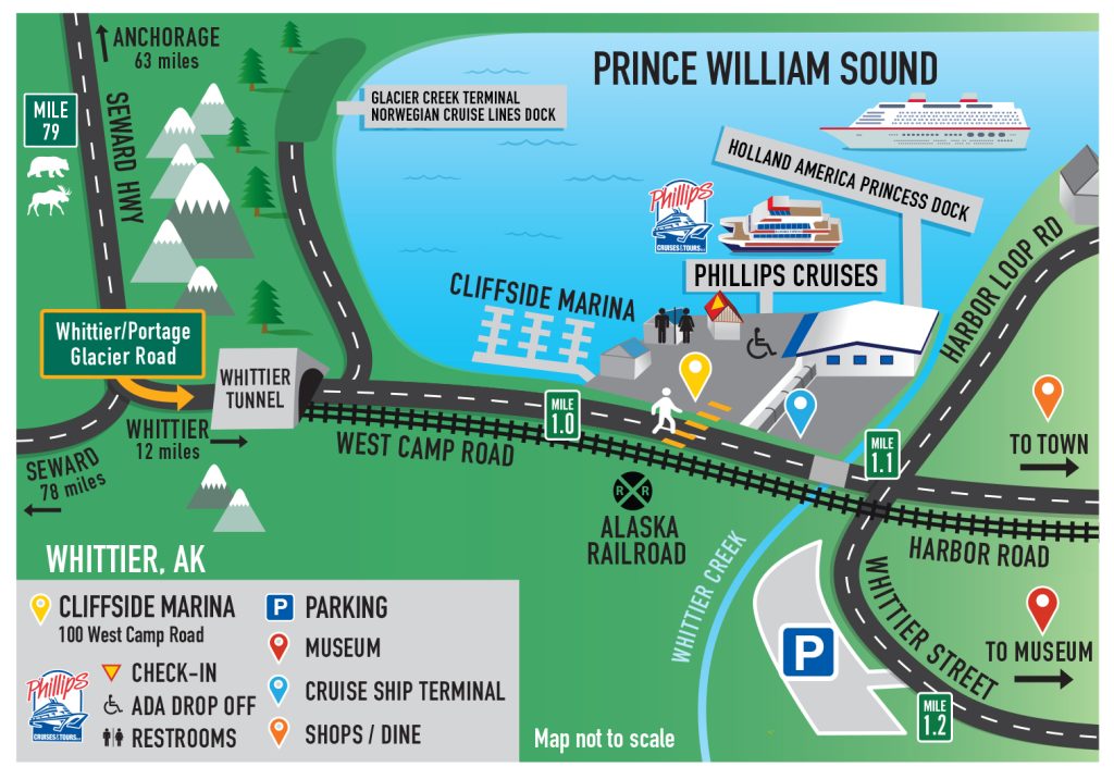 Address: W. Camp Road | Whittier, AK 99693 (Directly next to Phillips Cruises & Tours Dock)