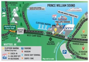 Please note cell phone service is very limited once you turn off the Seward Highway at Mile 79 onto the Portage Glacier Road. We strongly recommend that you download our ”Know Before You Go” document so you have driving directions and details on where to find us once in Whittier.